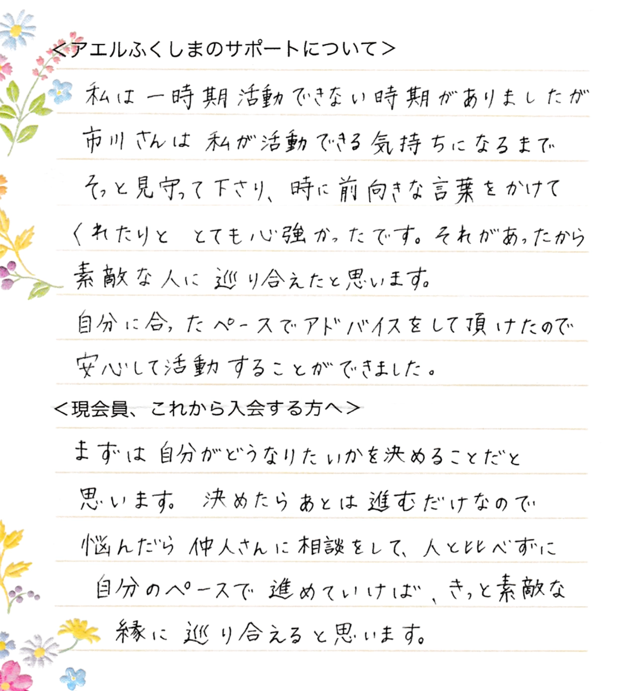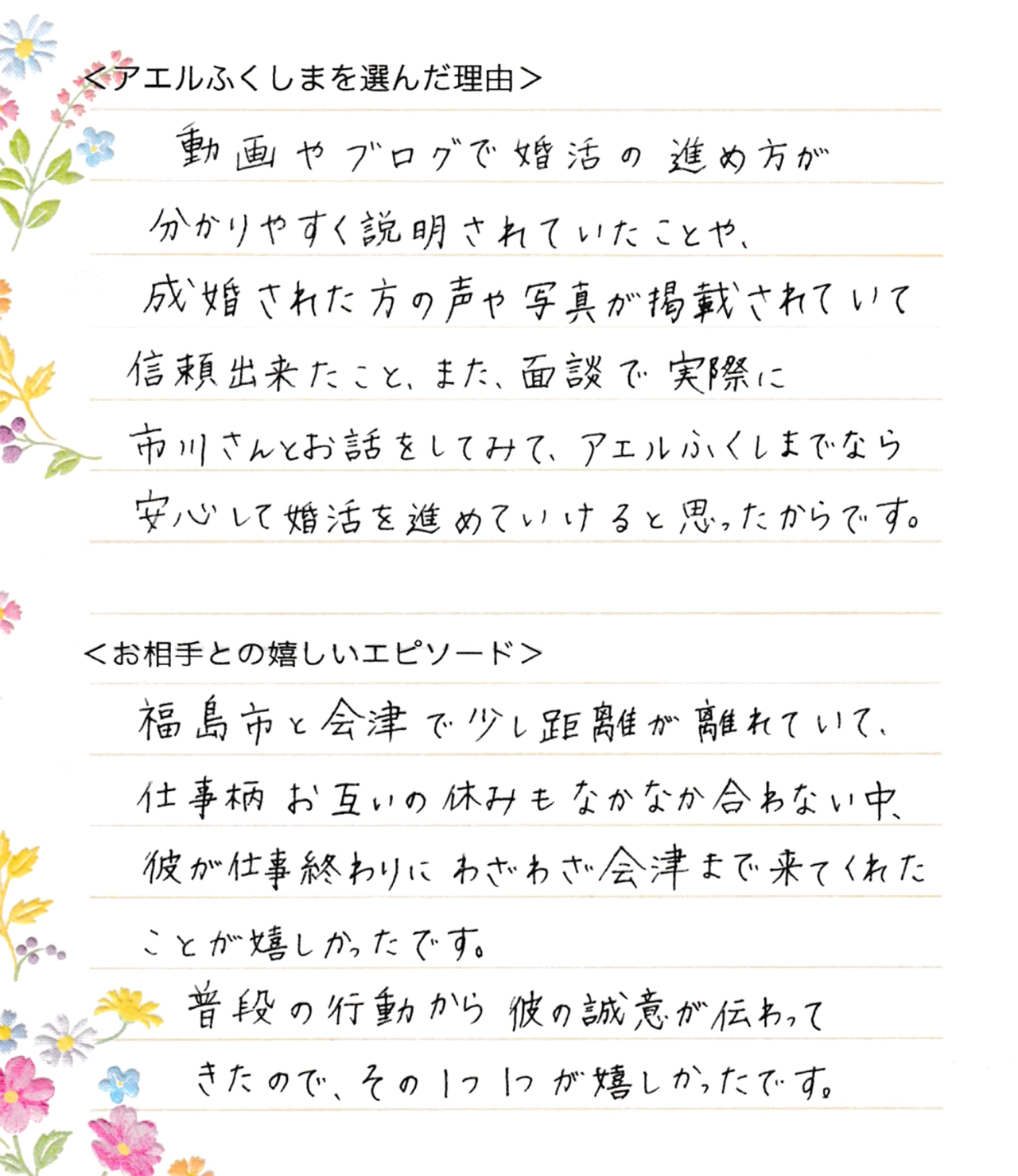動画やブログで婚活の進め方が分かりやすく説明されていたことや、成婚された方の声や写真が掲載されていて信頼できたこと、また、面談で実際に市川さんとお話をしてみて、アエルふくしまでなら安心して婚活を進めていけると思ったからです。
