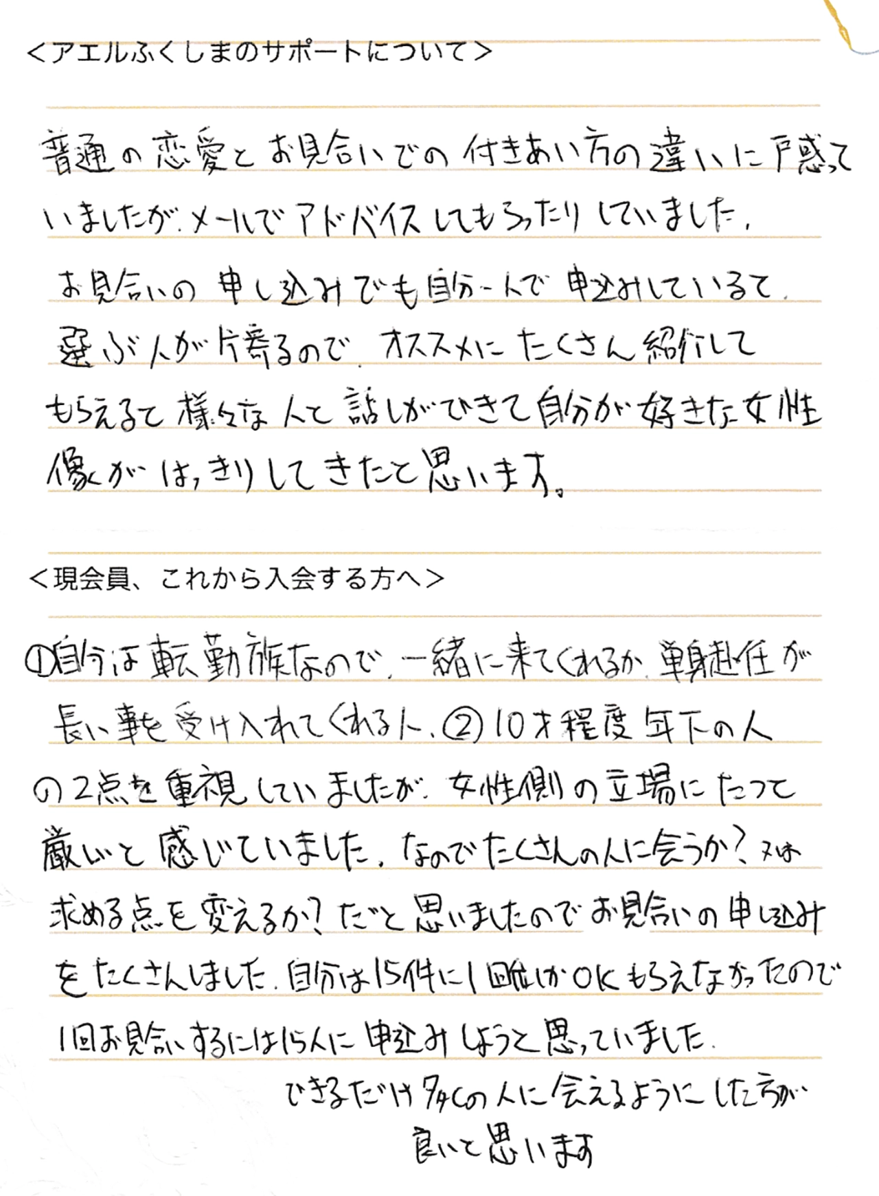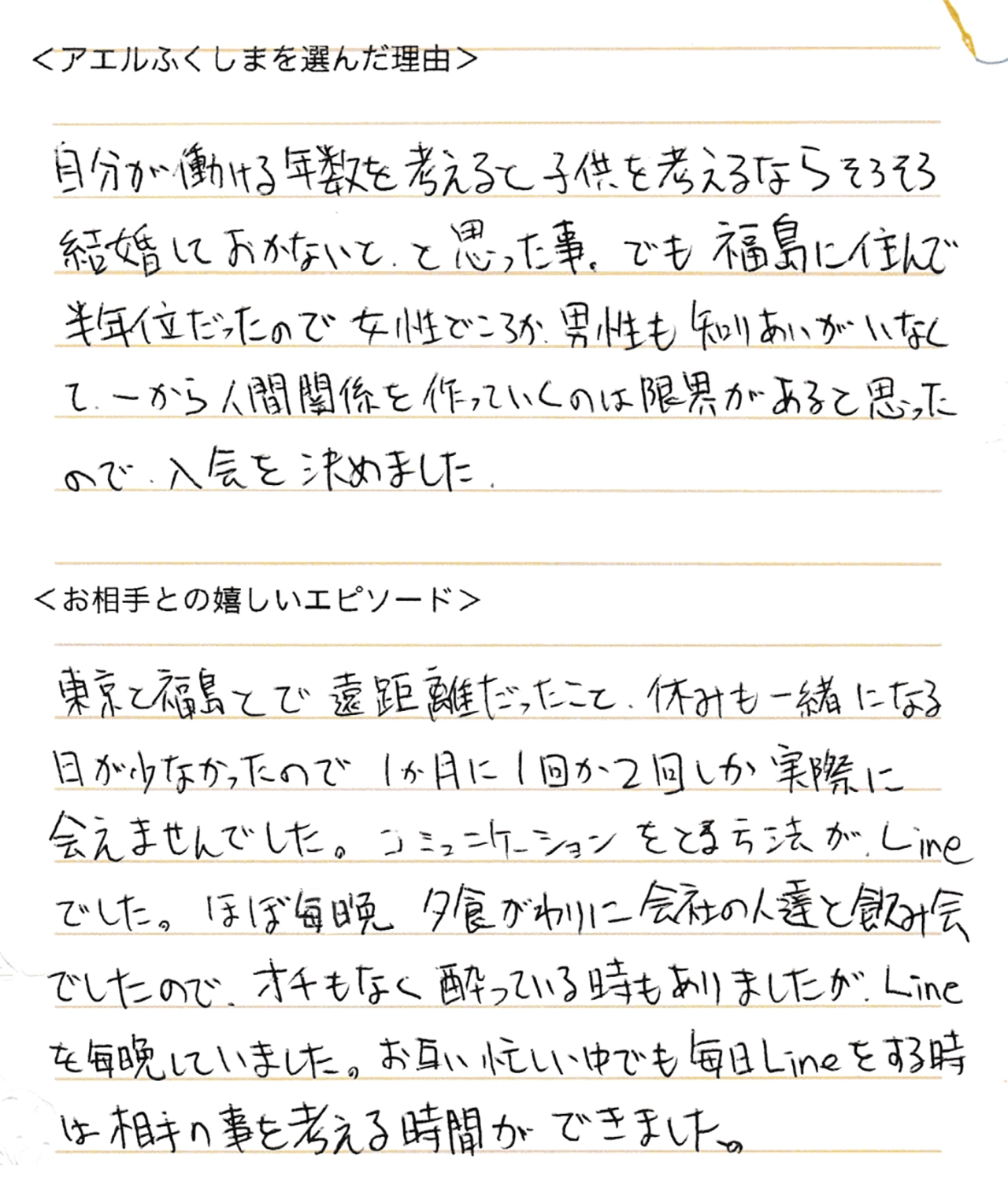 Fさん転勤族で、年齢的なことを考え福島で婚活を始めることになりました。
