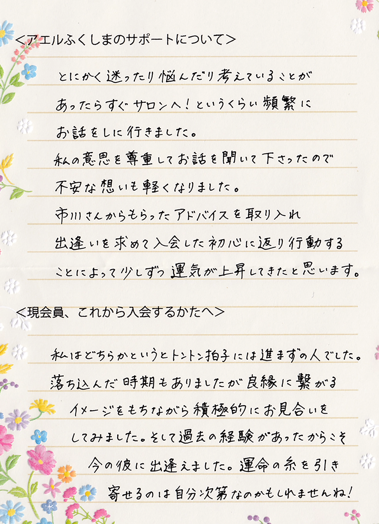 市川さんからもらったアドバイスを取り入れ、出逢いを求めて入会した初心に返り、行動することによって、少しずつ運気が上昇してきたと思います。